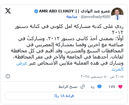 القيادي الإخواني عضو الجمعية التأسيسية لدستور 2012، عمرو عبد الهادي، قال عبر منصة "إكس"، إنه “لم يرَ أمل علم الدين أثناء كتابة الدستور”، لكنه أضاف أن الاستعانة بخبراء ومستشارين في الدساتير المقارنة كان أمرًا طبيعيًا للوصول إلى صياغة توافقية.