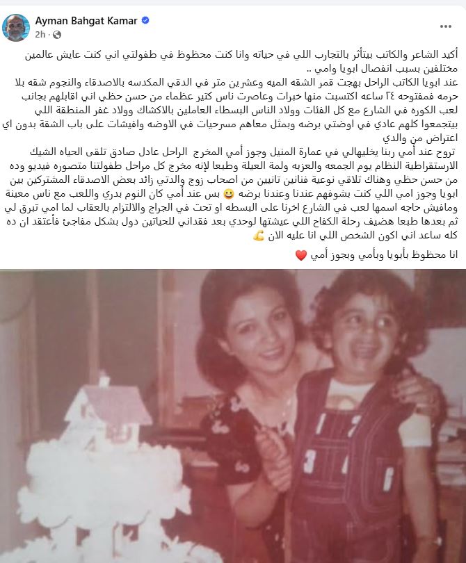 وكتب أيمن بهجت قمر منشورًا عبر حسابه الشخصي بموقع "فيسبوك"، تحدث فيه عن تجاربه خلال فترة الطفولة وكيف أسهمت في تشكيل موهبته الفنية.