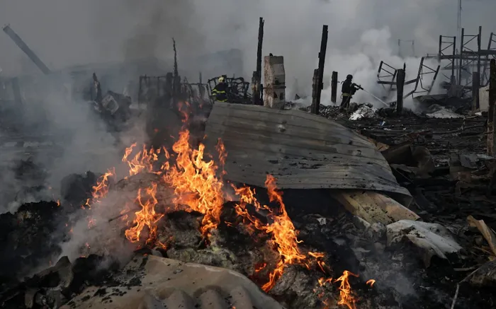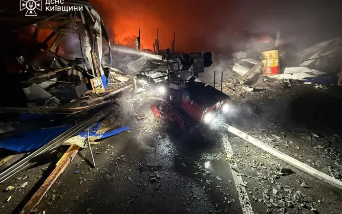 رجال إطفاء يكافحون حريقا في كييف عقب ضربة روسية بمسيّرات