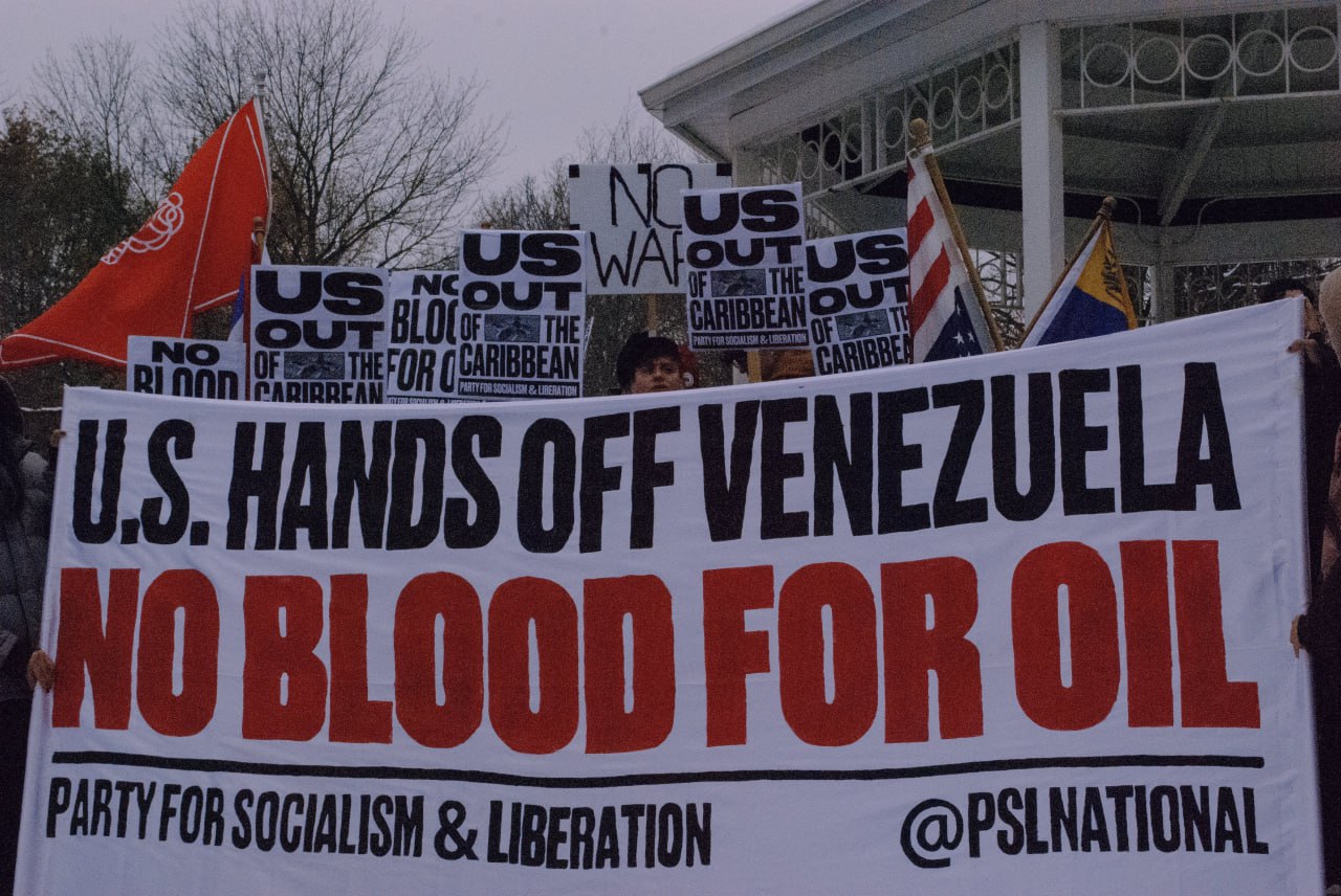 عبّر المتظاهرون عن رفضهم للانتشار العسكري الأمريكي في منطقة البحر الكاريبي بذريعة مكافحة تهريب المخدرات.