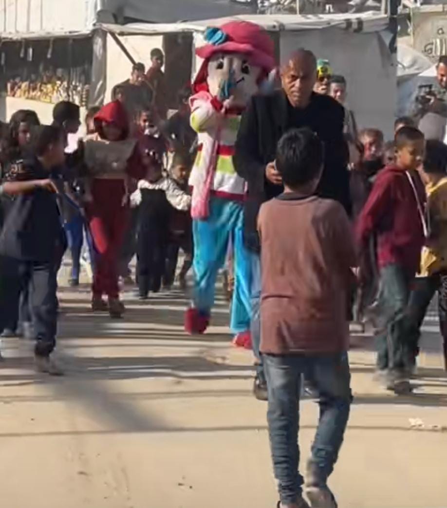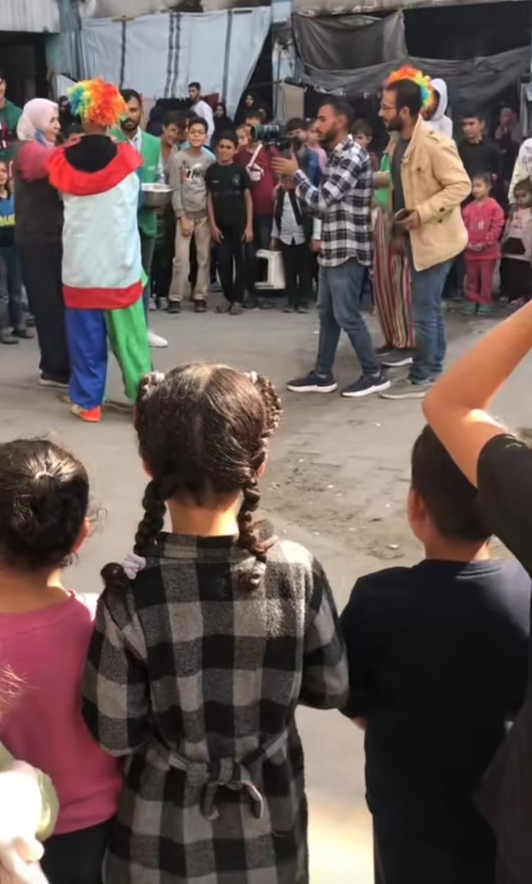 وفي مشهد آخر، ظهر مهرج آخر على دراجته، يتنقل بخفة بينما يطارده عشرات الأطفال بوجوه مليئة بالفضول والبهجة، ليعيد إشعال الحماس في قلوب الصغار ويمنحهم لحظات من المرح بعيدًا عن الواقع القاسي.