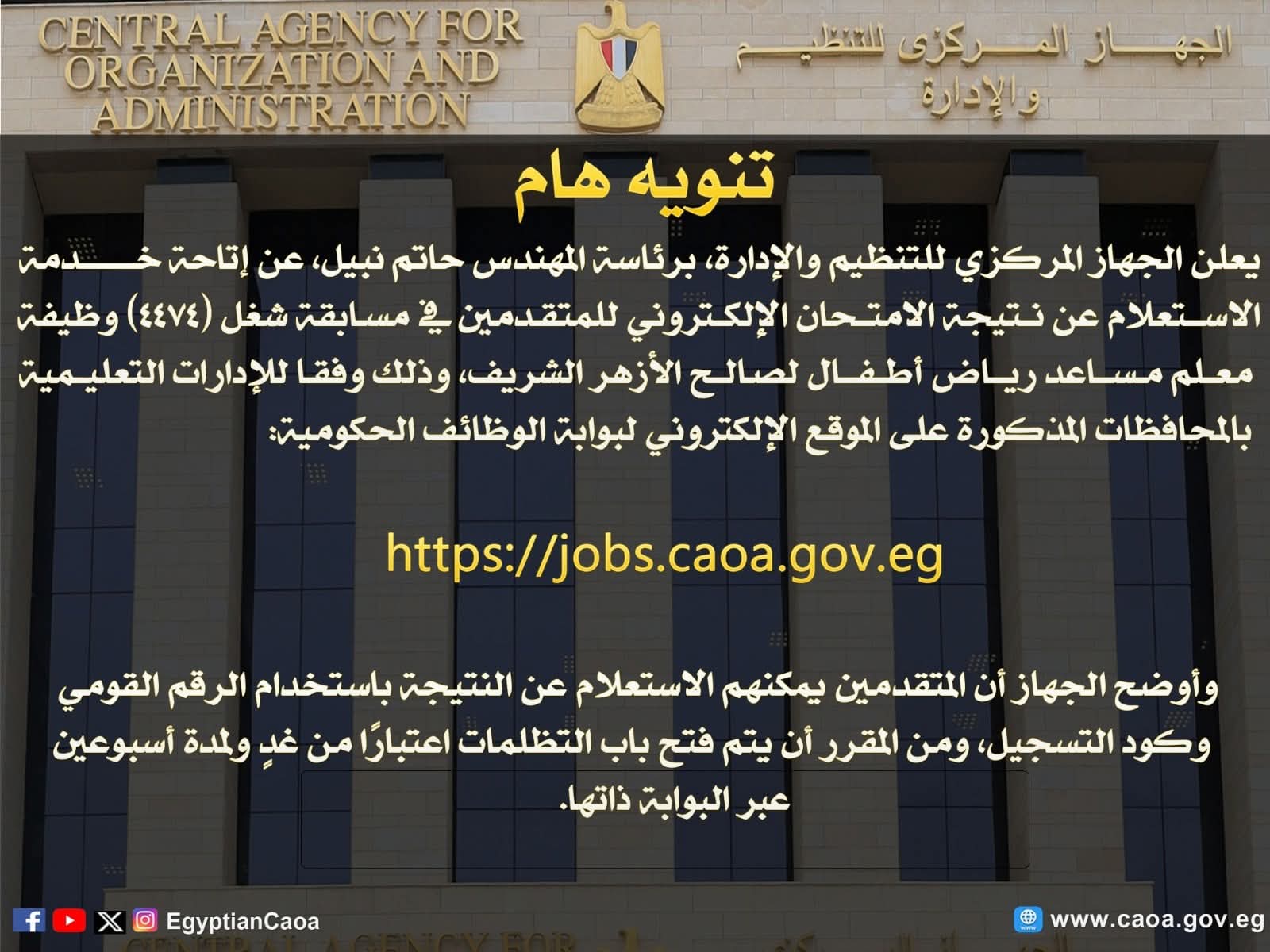 أعلن الجهاز المركزي للتنظيم والإدارة برئاسة المهندس حاتم نبيل عن إتاحة نتيجة مسابقة 4474 وظيفة معلم مساعد رياض أطفال بالأزهر الشريف، وذلك بعد انتهاء الاختبارات الإلكترونية والتقييم النهائي للمتقدمين.