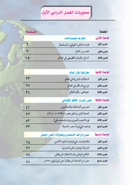 يشمل منهج الدراسات الاجتماعية المقرر على طلاب الصف الثالث الإعدادي أربع وحدات أساسية تضم موضوعات في الجغرافيا والتاريخ، وجاءت كالتالي: