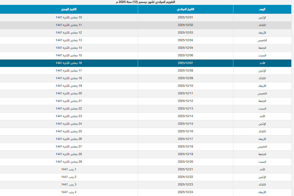 ويمكن للمواطنين الاطلاع على التقويم الهجري والميلادي لشهر ديسمبر 2025 من خلال الاطلاع على الصورة التالية: