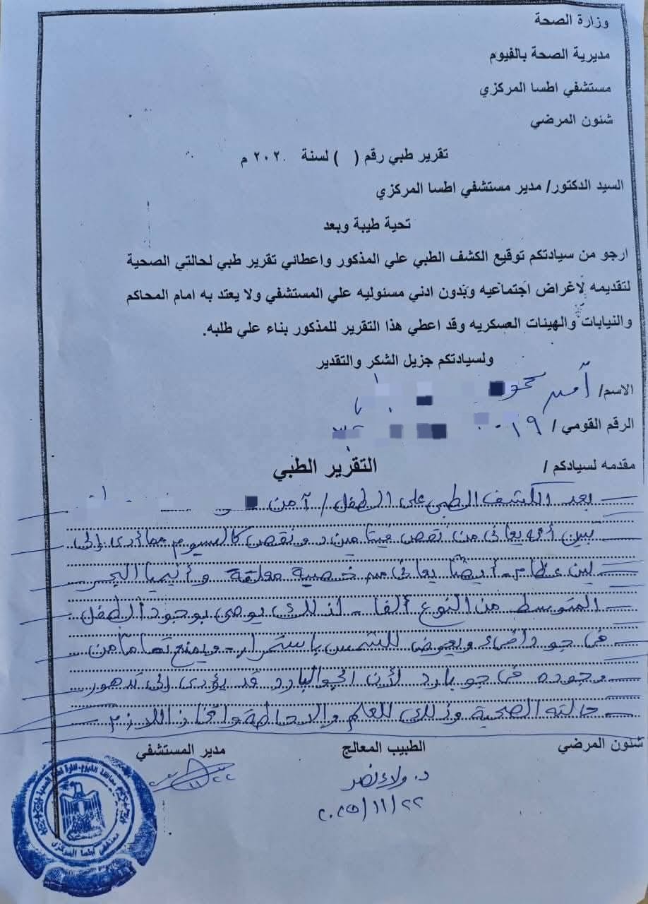 ذكر فيه إصابة الطفل بأنيميا البحر المتوسط، من غير الخضوع لتحليل جيني، وهو ما يثبت زيف ما ورد في التقرير، قام الزوج بنشره على صفحته الشخصية لتبرئة صورته، ثم حذفه بعد فترة.