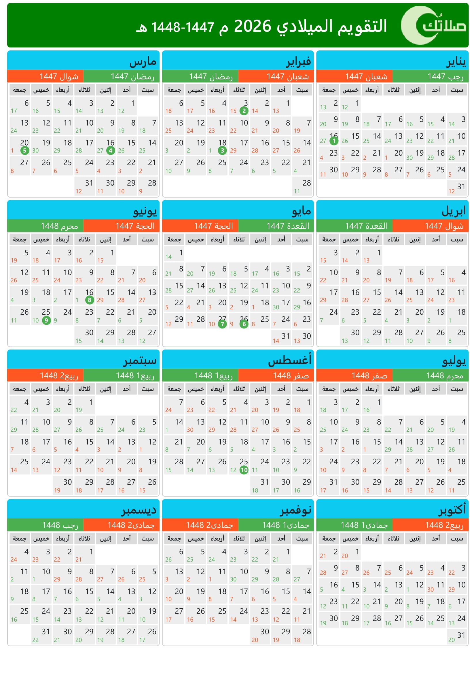 - 17 يونيو 2026: رأس السنة الهجرية 1448.
