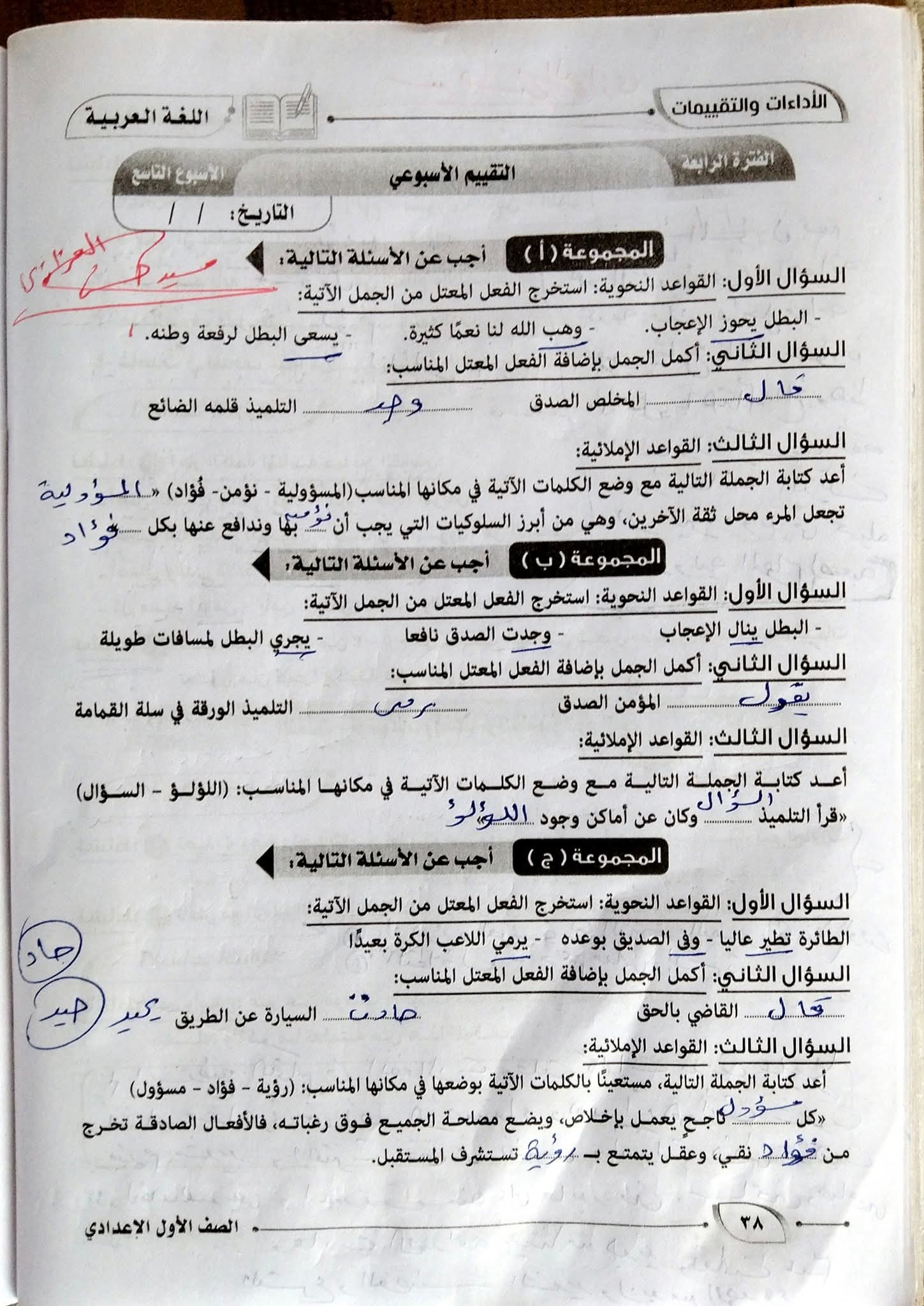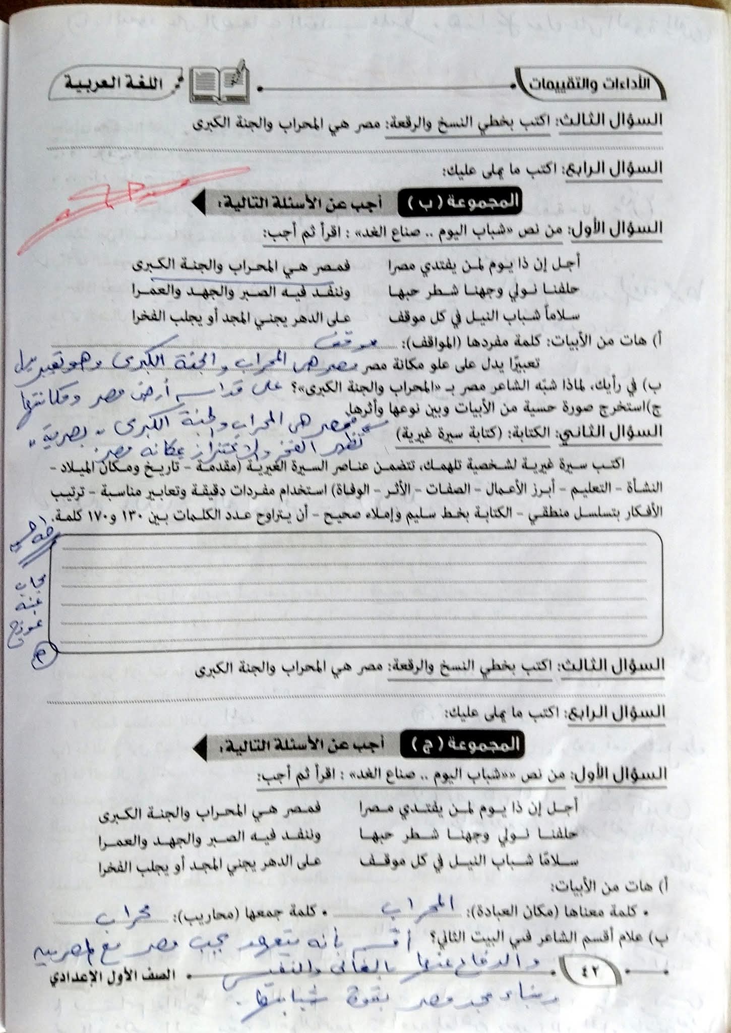 حل تدريبات كتاب المدرسة اللغة العربية الصف الأول الإعدادي