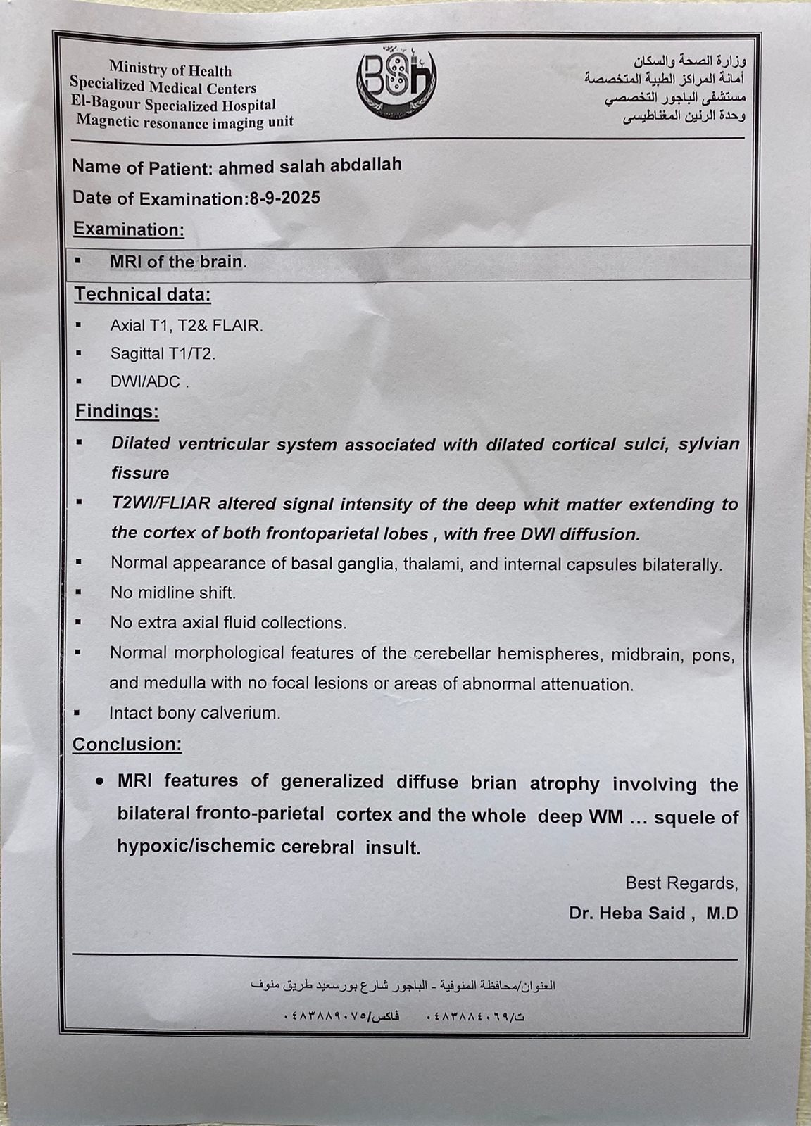 وقال إن والديّ أحمد، في حالة من الانهيار النفسي، في ظل صغر سنه، وخوفهم من نقله إلى مستشفى آخر، خوفًا من رفض استقباله، رغم حاجته العاجلة إلى فريق متخصص من أطباء الأعصاب والعناية المركزة لتقييم حالته ووضع علاج واضح له، ووجهت الأسرة نداءً عاجلًا لإنقاذ ما يمكن إنقاذه من حياة.