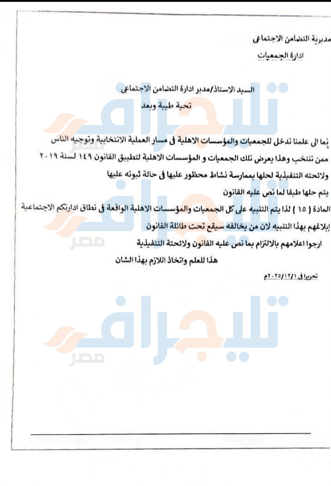 وطالبت الإدارات الاجتماعية بإبلاغ جميع الجمعيات والمؤسسات الواقعة في نطاق اختصاصها بهذا التنبيه، مؤكدة أن أي مخالفة ستُواجه بتطبيق القانون دون تهاون.