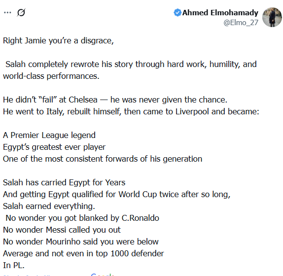 وقال المحمدي في رده على كاراجر: "صحيح يا جيمي، أنت عار"، مؤكدًا أن صلاح هو من أعاد كتابة قصته بنفسه بفضل العمل الجاد والتواضع، ومن خلال أدائه العالمي الذي حققه في أوروبا.