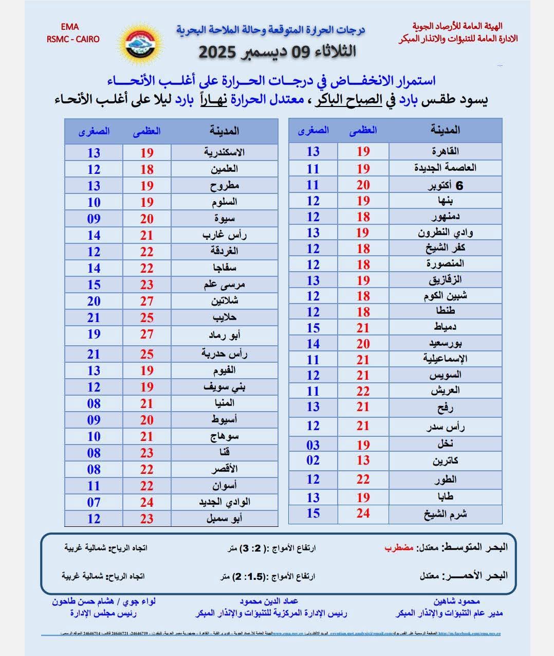 وجاءت درجات الحرارة المتوقعة كالآتي: