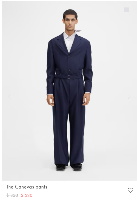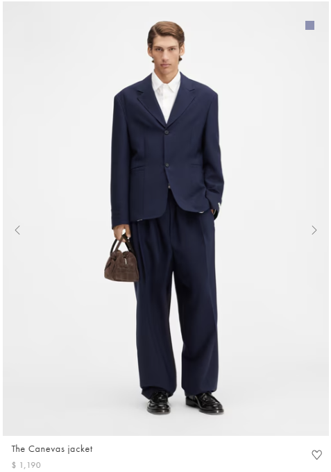 البدلة مكونة من سترة وبنطال من الصوف مزود بحزام من نفس الخامة، وأزرار منقوشة بنقشة جلد التمساح من مجموعة la croisière، بالإضافة إلى رقعة من قماش الكالسيون المطبوع عليها اسم العلامة التجارية، وتباع السترة فقط بسعر 1190 دولار أمريكي عبر الموقع الإلكتروني لدار الأزياء، فيما يتوفر البنطال بسعر 520 دولار، وتتوفر القطع حاليًا باللون الكحلي فقط.