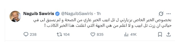 وكتب ساويرس في منشور له على منصة إكس: "بخصوص الخبر الخاص بزيارتي لتل أبيب.. الخبر عاري من الصحة، ولم يسبق لي في حياتي ان زرت تل أبيب، ولا أعلم من هي الجهة التي أعلنت هذا الخبر الكاذب".