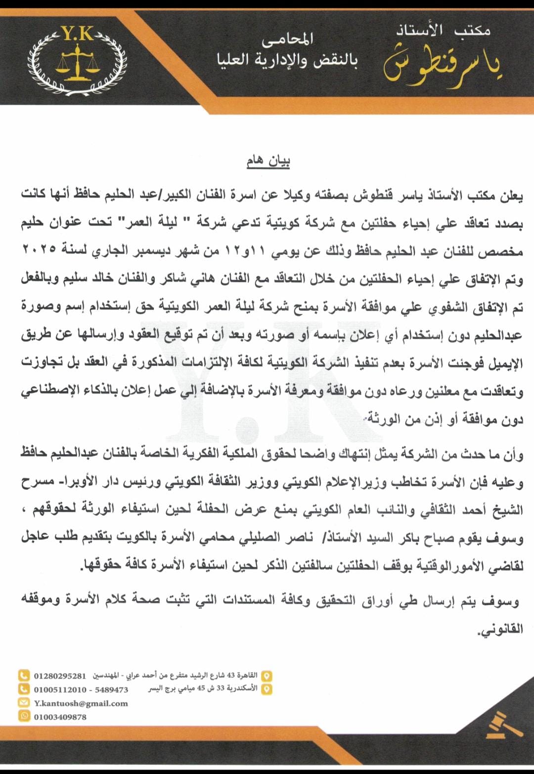 أعلنت أسرة الفنان الراحل عبد الحليم حافظ، عبر مكتب المحامي ياسر قنطوش، عن تقديم طلب عاجل إلى النائب العام الكويتي لوقف عرض حفلين منسوبين للفنان الراحل، بدعوى انتهاك حقوق الملكية الفكرية الخاصة بالأسرة.