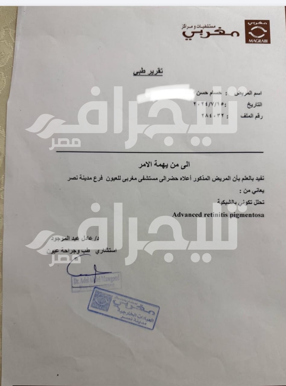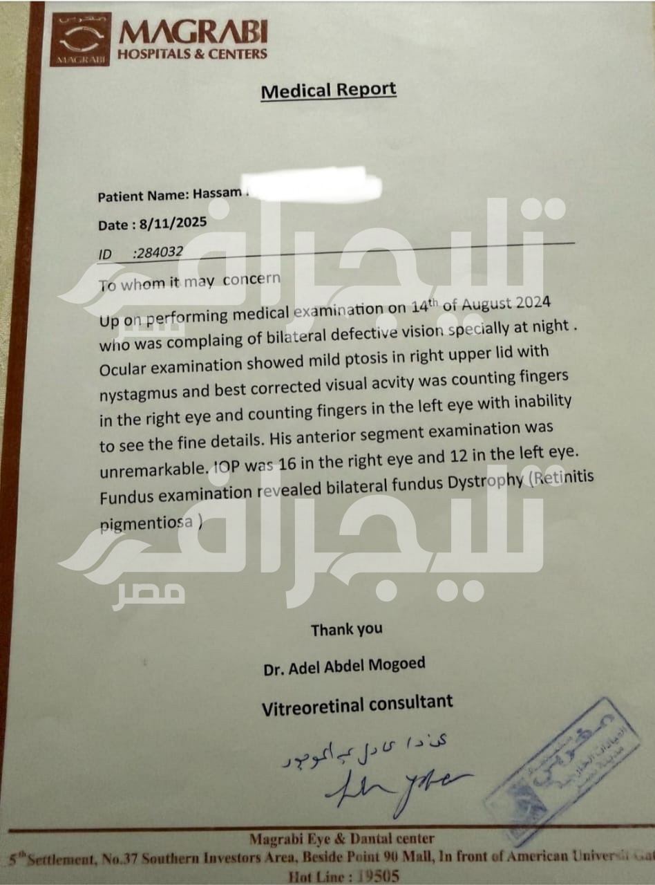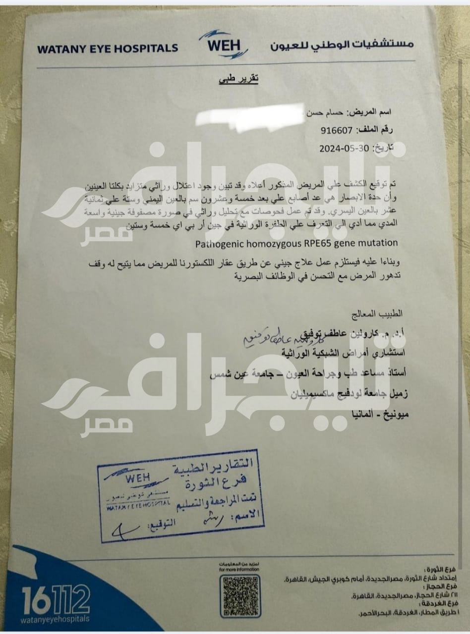 وأضاف حسام في تصريحات لـ“تليجراف مصر”، أنه خضع لتحليل جيني خارج مصر في 2023 بمساعدة الدكتورة كارولين عاطف في المستشفى الوطني، وأكدوا له أنه لديه طفرة في جين RPE65، وأن حالته يتوفر لها علاج عن طريق علاج جيني اسمه “Luxturna”.