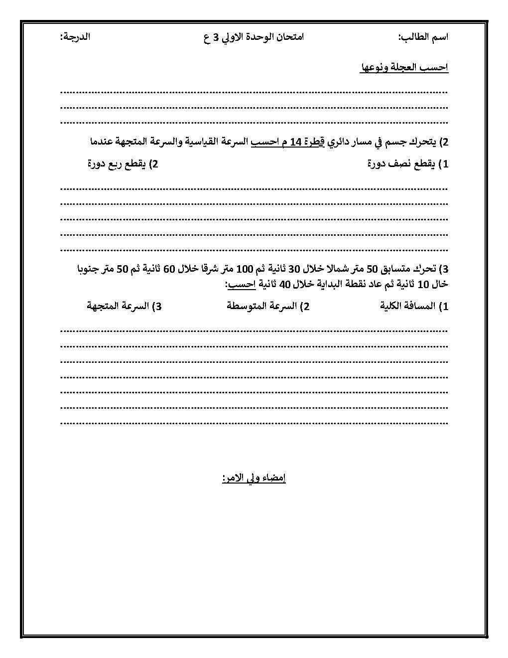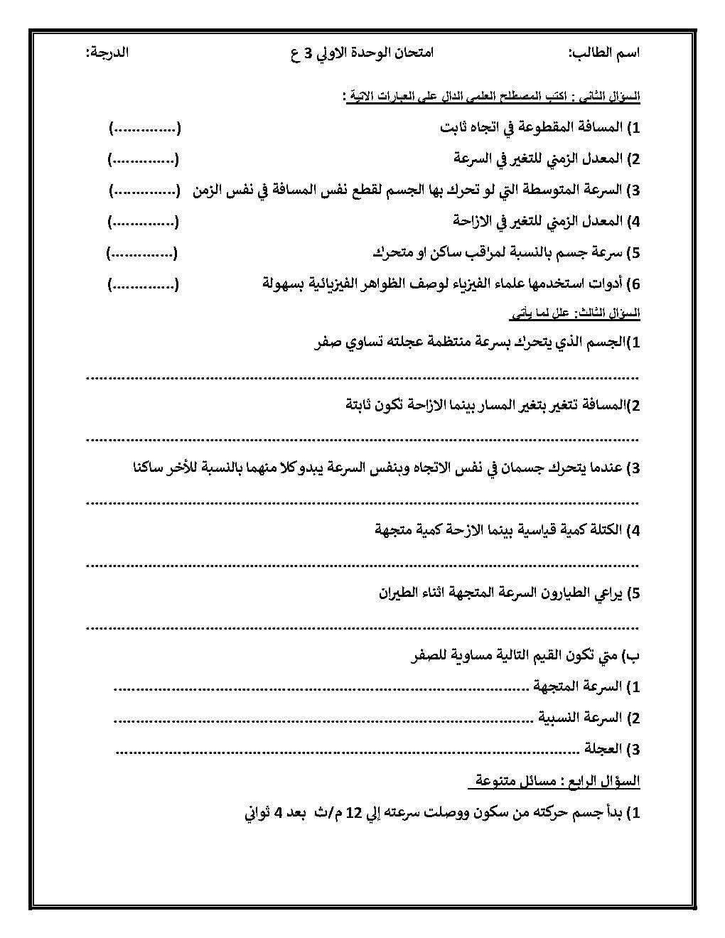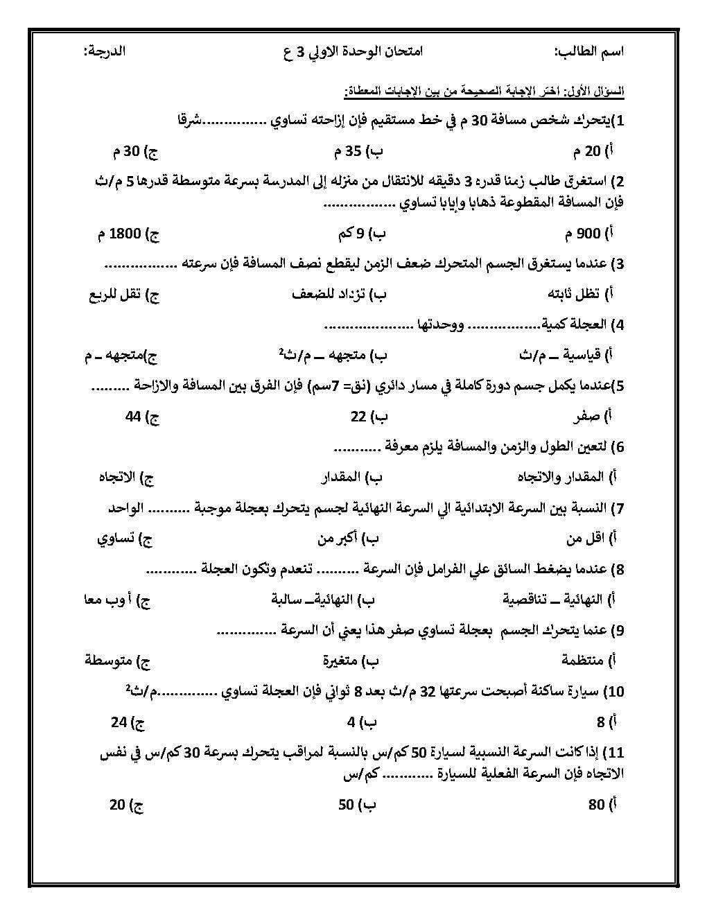امتحان على الوحدة الأولى علوم للصف الثالث الإعدادي