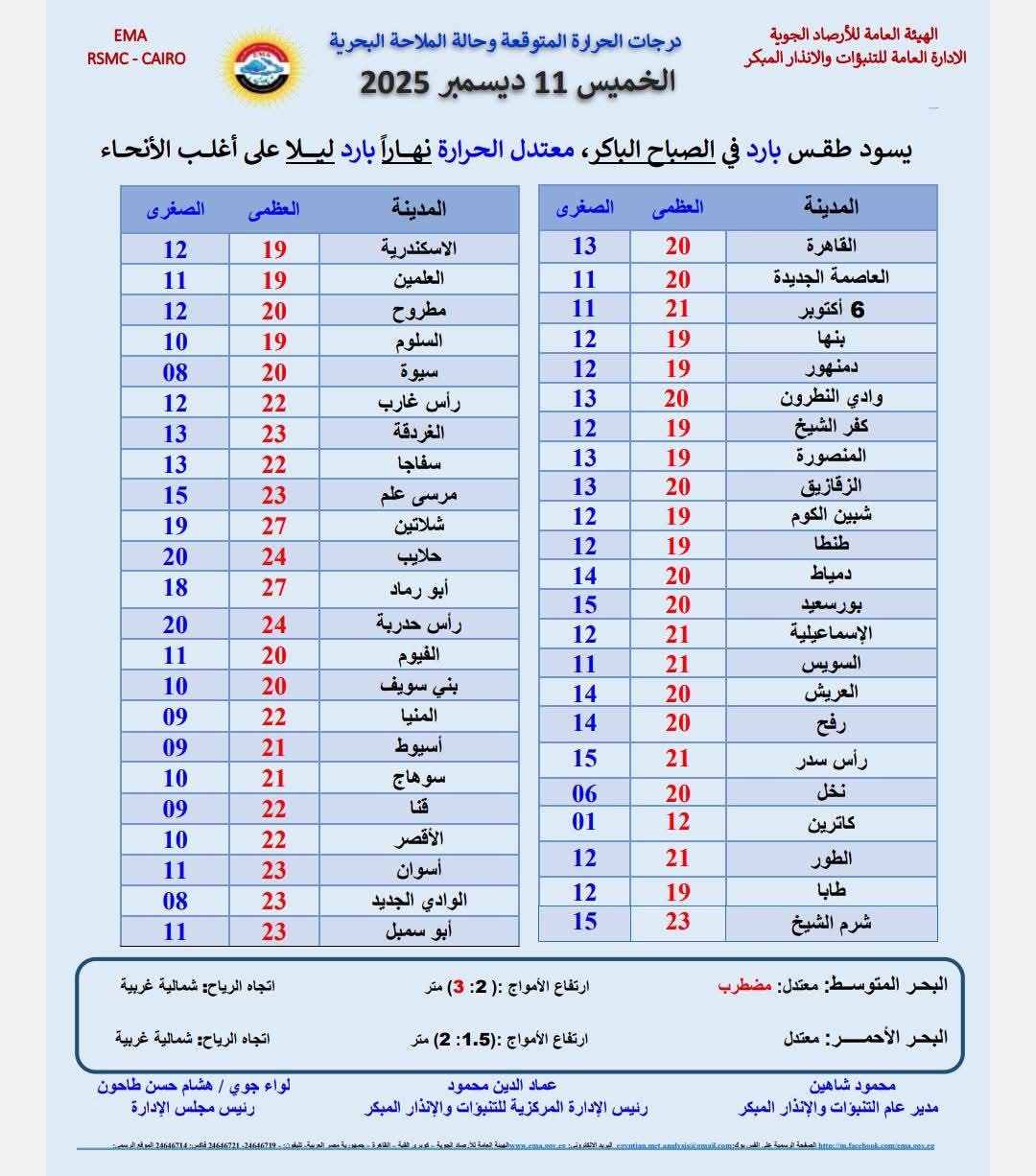 درجات الحرارة اليوم الخميس 11 ديسمبر 2025