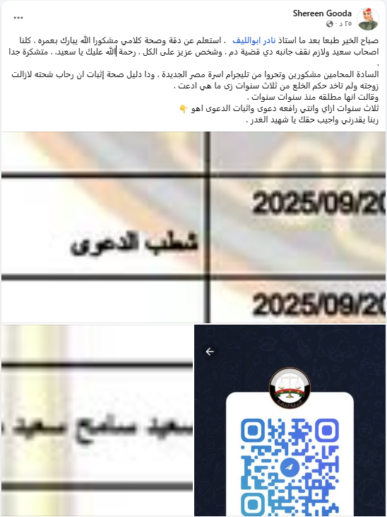 ونشرت المحامية عبر صفحتها الشخصية بموقع "فيسبوك" صورًا من “رول” جلسات محكمة الأسرة أحداها محرر في 20 سبتمبر الماضي بشطب الدعوى وأخرى في 10 نوفمبر الماضي لإعادة الإعلان وعرض الصلح.