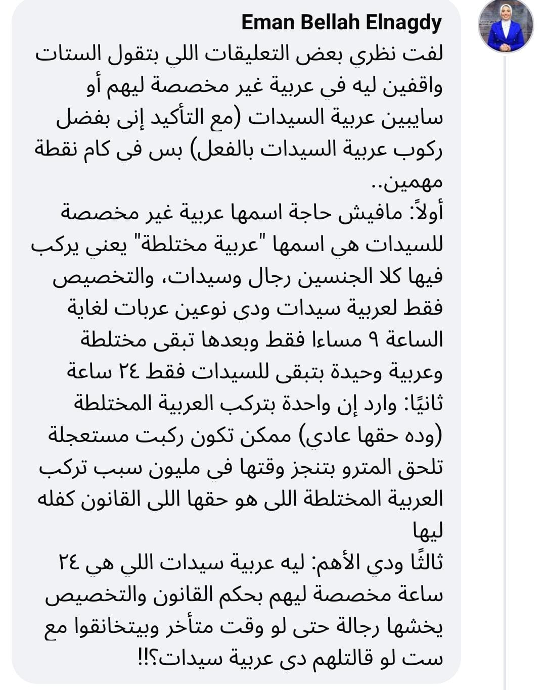وأضافت أن ركوب النساء للعربات المختلطة أمر قانوني ومسموح به، وأن مشكلة تسلل الرجال لعربات السيدات التي تعمل على مدار الساعة تستحق اهتمامًا أكبر.