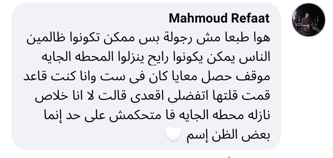 وقال سعيد عبدالحكيم الشاب الذي ظهر في الصورة لـ“تليجراف مصر”، الصورة المتداولة لو كانت السيدة حاملًا أو متقدمة في العمر لكان وقف لها فورًا ودون تردد، مؤكدًا أن العربة كانت شبه خالية وليس مزدحمة، مضيفًا: “محدش قال لي قوم”، وتساءل بتعجب: "إزاي أرتاح وأقعد وهي تتعب من الوقفة!".