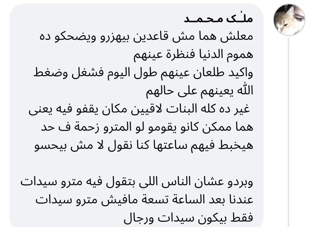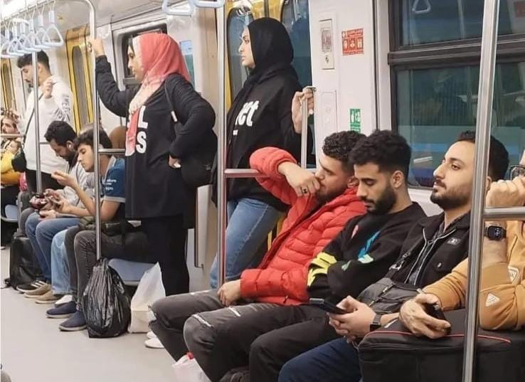 تداول رواد وسائل التواصل الاجتماعي صورة التقطت داخل إحدى عربات المترو تظهر فيها مجموعة من البنات واقفات بينما بعض الشباب جالسين، ما أثار نقاشًا واسعًا حول حق الجلوس داخل العربات “المختلطة” والمخصصة أيضًا للنساء.