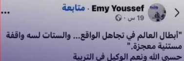 وعلقت إيمي يوسف بقوله: “أبطال العالم في تجاهل الواقع.. والستات لسة واقفة مستنية معجزة” وأكملت إيمي مضيفة، حسبي الله ونعم الوكيل في التربية.