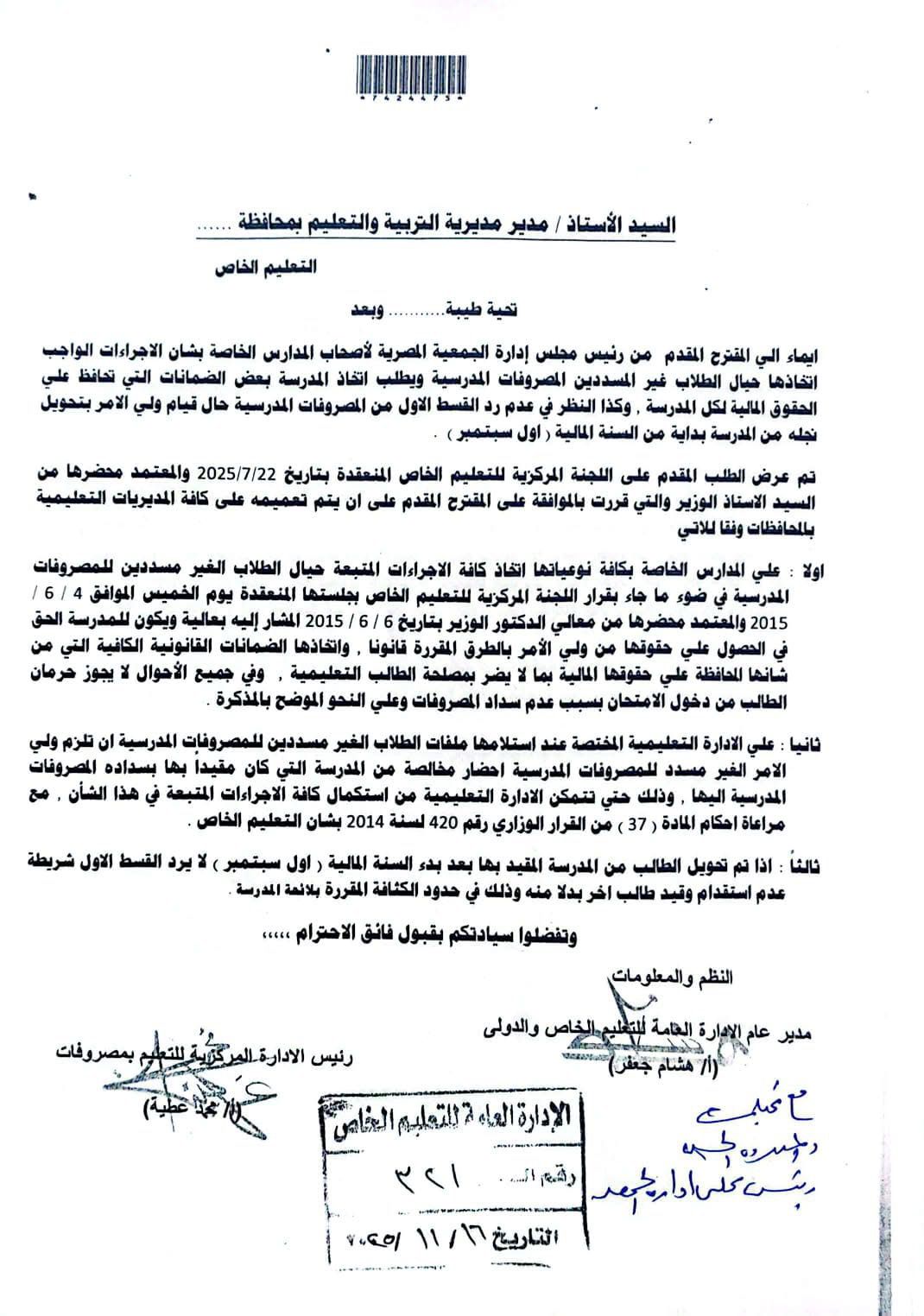 أولًا: على المدارس الخاصة بكافة نوعياتها اتخاذ كافة الاجراءات المتبعة حيال الطلاب غير المسددين للمصروفات المدرسية في ضوء ما جاء بقرار اللجنة المركزية للتعليم الخاص والمعتمد محضرها من الوزير ويكون للمدرسة الحق في الحصول على حقوقها من ولي الأمر بالطرق المقررة قانونًا واتخاذها الضمانات القانونية الكافية التي من شانها المحافظة على حقوقها المالية بما لا يضر بمصلحة الطالب التعليمية، وفي جميع الأحوال لا يجوز حرمان الطالب من دخول الامتحان بسبب عدم سداد المصروفات وعلي النحو الموضح بالمذكرة.