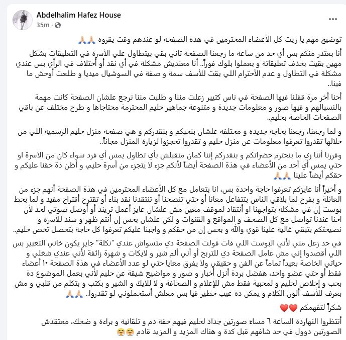 وأضافت أسرة عبد الحليم: “قررنا— نحترم حضراتكم ونقدّركم—ألا نقبل بأي تطاول يمس أي فرد من الأسرة أو حتى أي عضو من أعضاء الصفحة، لأنكم جزء لا يتجزأ من أسرة حليم، وأظن أن هذا حقنا عليكم وحقكم علينا أيضًا”.
