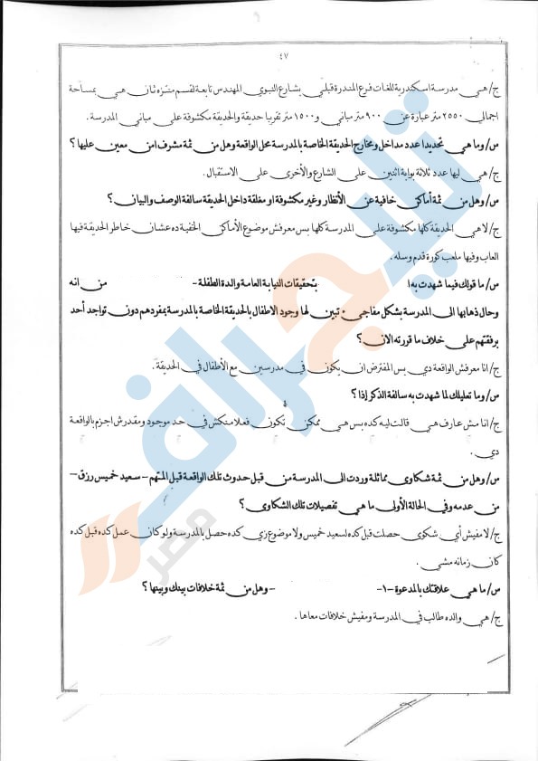 ج/ وصلني اليوم اتصال من أمين شرطة بالنيابة يفيد بوجود استدعاء بسبب واقعة تحرش داخل المدرسة، تواصلت مع المحامي فعلمت بوجود بلاغ ضد عامل بالمدرسة، ولا أملك أي معلومات إضافية.
