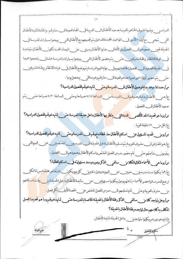 القادمون بسيارات المدرسة: يدخلون من بوابة خاصة مع المشرف، ثم يُسلمون لستة مدرسين داخل الحديقة، كل منهم في نقطة لمتابعتهم حتى حضور مدرس الفصل.