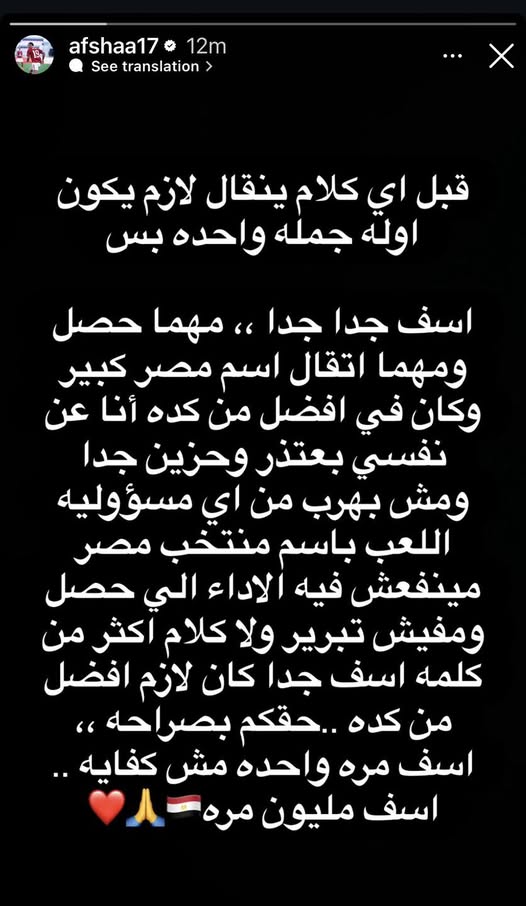 وكتب أفشة، عبر حسابه الشخصي على انستجرام: “قبل أي كلام يُقال لازم تكون أول جملة واحدة بس، آسف جدًا جدًا، ومهما حصل ومهما اتقال، اسم مصر كبير وكان في أفضل من كده، أنا عن نفسي بعتذر وحزين جدًا ومش بهرب من أي مسؤولية، اللعب باسم منتخب مصر مينفعش فيه الأداء اللي حصل، ومفيش تبرير ولا كلام أكثر من كلمة آسف جدًا، كان لازم أكون أفضل من كده، آسف مليون مرة”.
