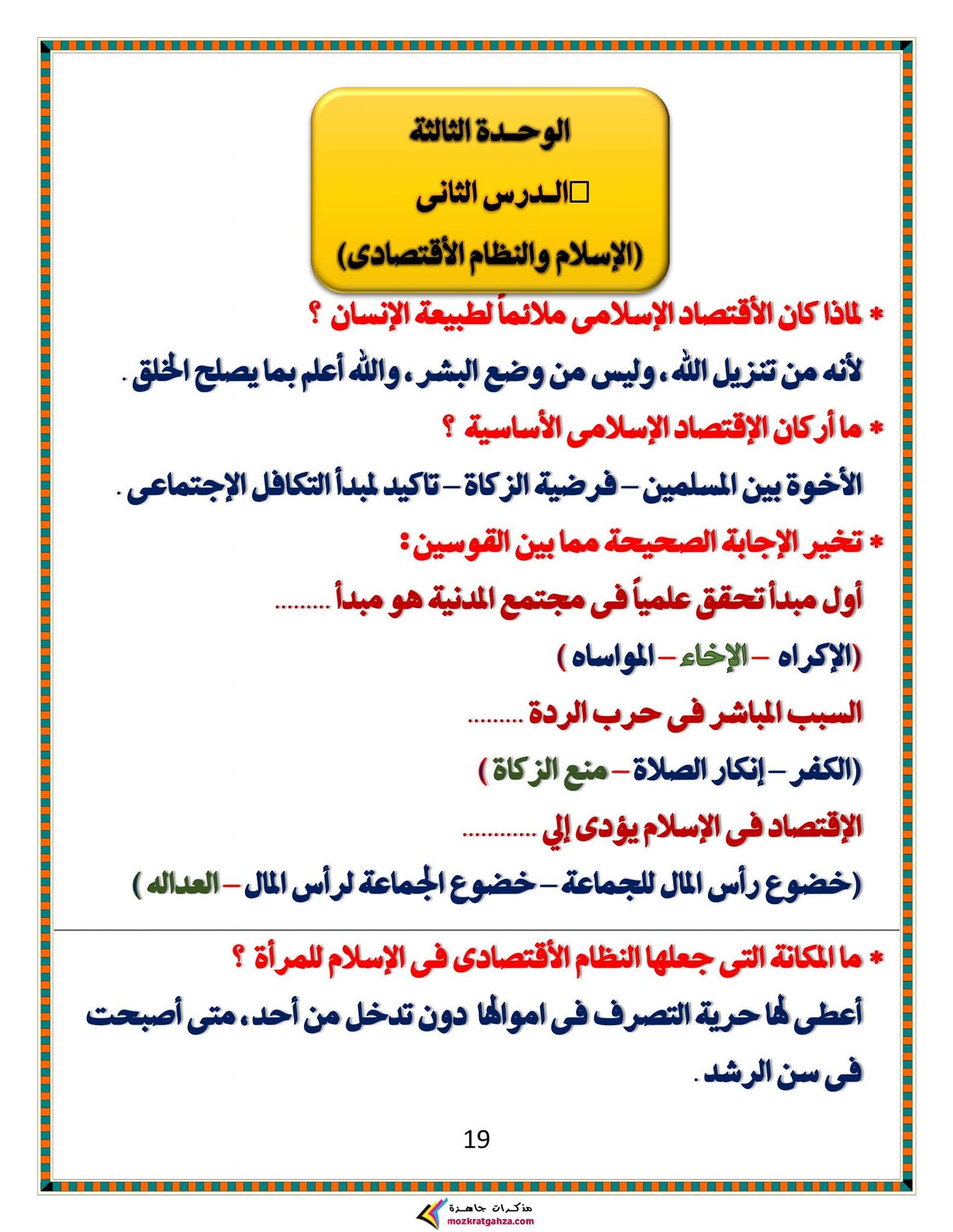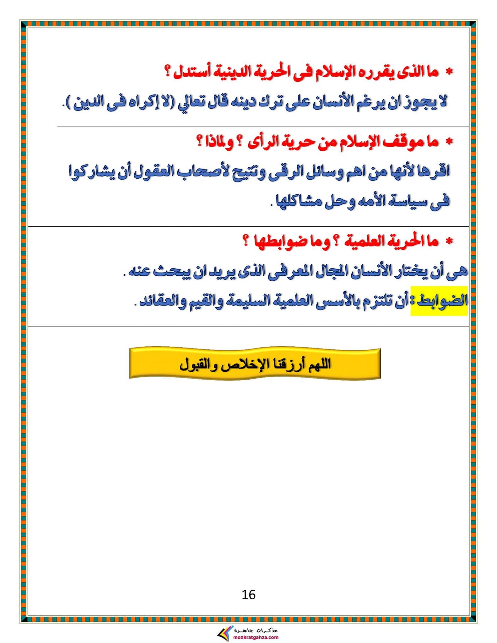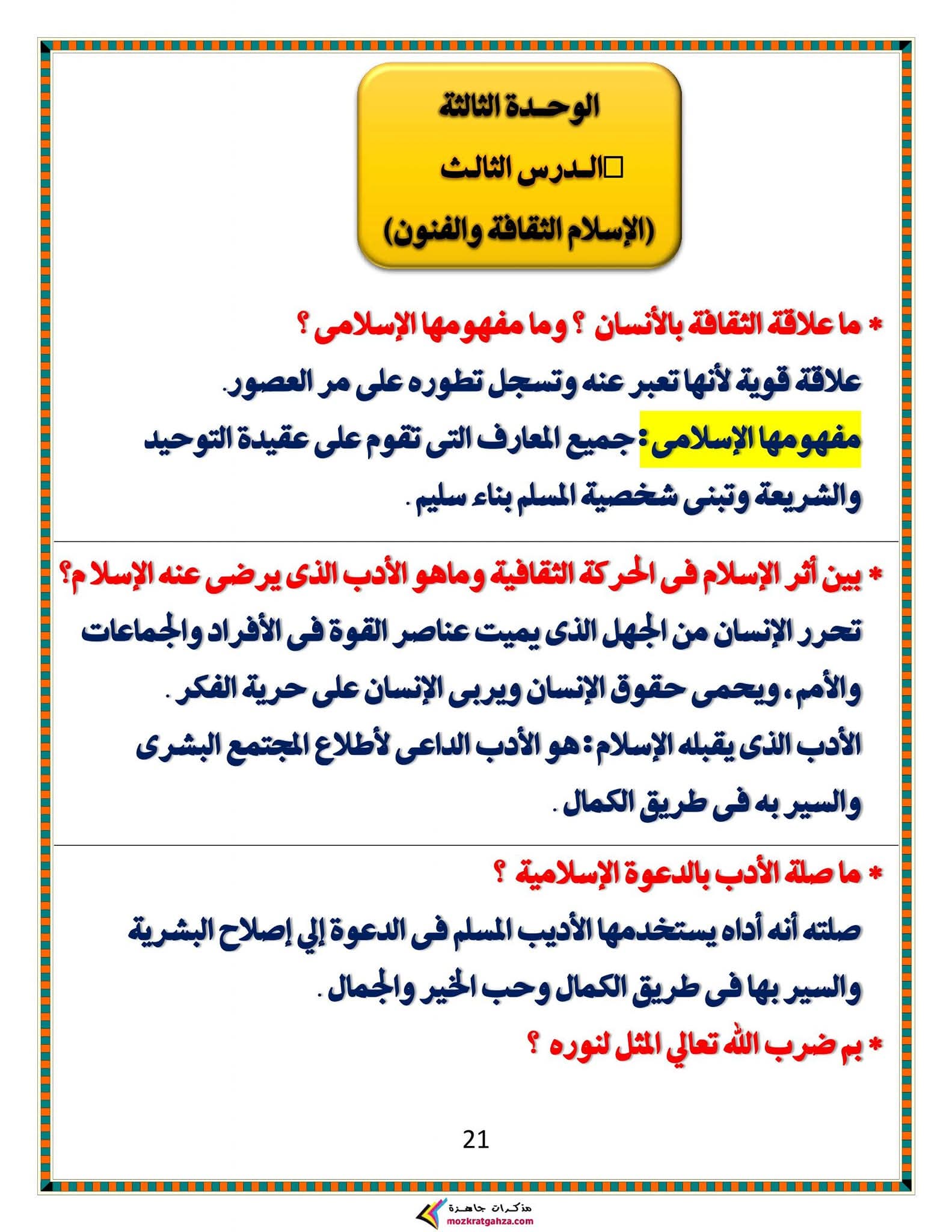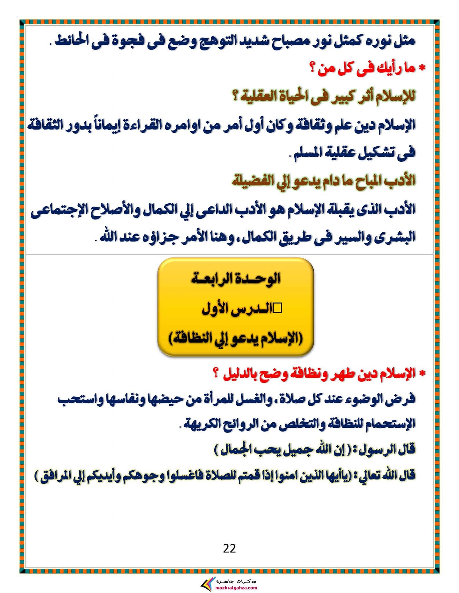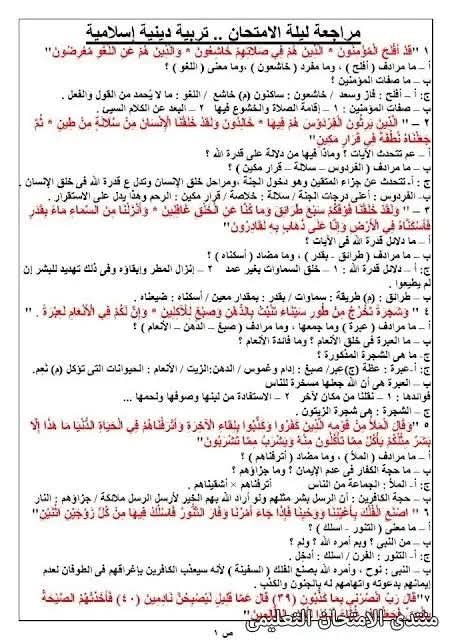 ويتمكن طلاب الشهادة الإعدادية مراجعة مادة الدين الإسلامي من خلال المراجعة التالية: