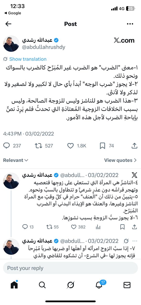 وكان رشدي قد أوضح حدود ضرب الزوجة في الإسلام، في تغريدة قديمة عبر المنصة نفسها في 2022، والتي جاءت في مجموعة من النقاط كالآتي:
