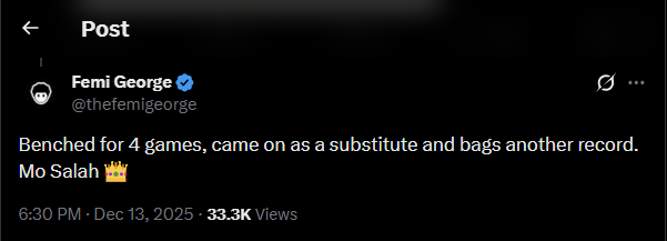 في حين عبر مشجع ثالث عن سعادته بمساهمة صلاح التهديفية اليوم، بالرغم من المشاركة كبديل في اللقاء والجلوس احتياطيًا لـ4 مباريات.