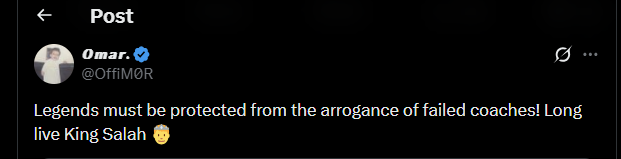 وعلى ما يبدو أن هناك عددا من مشجعي ليفربول انحازت لـ صلاح في خلافه مع الهولندي أرني سلوت المدير الفني للفريق، بعد جلوس قائد الفراعنة احتياطيًا لأكثر من مباراة، وغرد أحد مشجعي ليفربول قائلًا:" يجب حماية الأساطير من غرور المدربين الفاشلين، عاش الملك صلاح".