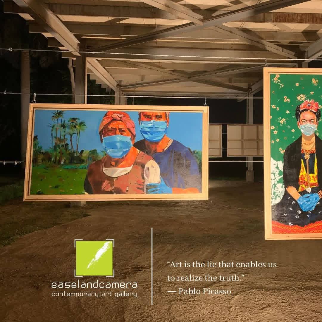وتابع: "كتير حاولوا يرموها على زوجة الفنان السابقة بس الصراحة استمتعت كتير بقراءة التعليقات.. اللوحة دي بالنسبة لي مهمة جدا كانت أول لوحة انفذها في مرسمي من المجموعة والظريف إني كنت لسه في مرحلة بناء المرسم الأخير فرسمتها في غرفة صغيرة وضيقة لأني ماكانش عندي ساعتها مرسم وكنت سيبت مرسمي القديم.. وجاءت اللوحة كأول مرة أمسك الألوان بعد انقطاع وقت ليس بالبسيط، انقطعت فيه لرسم الاسكتشات في غرفة الاستراحة في مزرعتي هربا من البيت وقت الحظر الطويل".