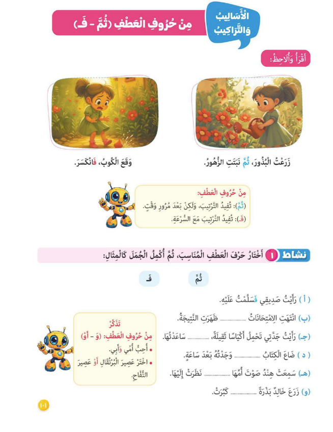 ومن أشهر حروف العطف: الواو، الفاء، ثم، أو، بل، لكن، وكل حرف منها له استخدام بسيط يساعد التلميذ على فهم ترتيب الأحداث أو الاختيار بين الأشياء، مما يسهم في تحسين مهارات القراءة والكتابة لدى الطلاب.