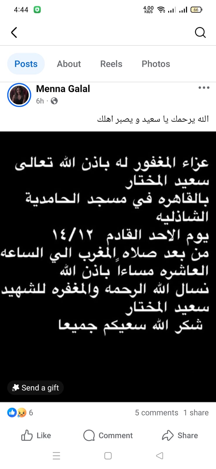 وقالت منه جلال عبر صفحتها الشخصية على موقع "فيسبوك": "الله يرحمك يا سعيد ويصبر أهلك، عزاء المغفور له بإذن الله تعالى سعيد مختار، بالقاهرة في مسجد الحامدية الشاذلية، يوم الأحد 14 ديسمبر، من بعد صلاة المغرب وحتى الساعة العاشرة مساءً بإذن الله"، نسأل الله الرحمة والمغفرة للشهيد سعيد مختار، شكر الله سعيكم جميعًا".