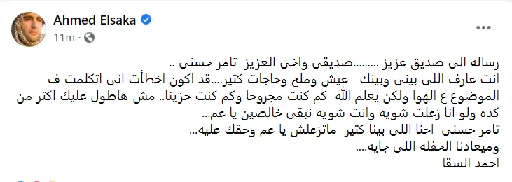 وكتب أحمد السقا عبر حسابه الرسمي على «فيسبوك»: «رسالة إلى صديقي العزيز تامر حسني، أنت عارف اللي بيني وبينك عيش وملح وحاجات كتير.. قد أكون أخطأت في الموضوع على الهوا، ولكن يعلم الله كم كنت محروجًا وحزينًا، مش هطول عليك أكتر من كده، ولو أنا زعلت شوية وإنت شوية نبقى خالصين يا عم.. تامر حسني، اللي بينا كتير، متزعلش، وحقك عليّ».