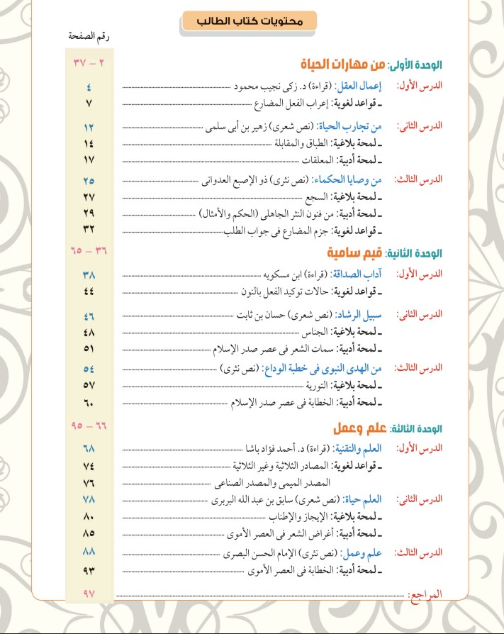 يشمل منهج اللغة العربية للصف الثاني الثانوي على دراسة 3 وحدات رئيسية مقررة بالكتاب، والتي جاءت متنوعة بين القراءة والنصوص الشعرية والنثرية، وجاء محتوى المنهج كالتالي: