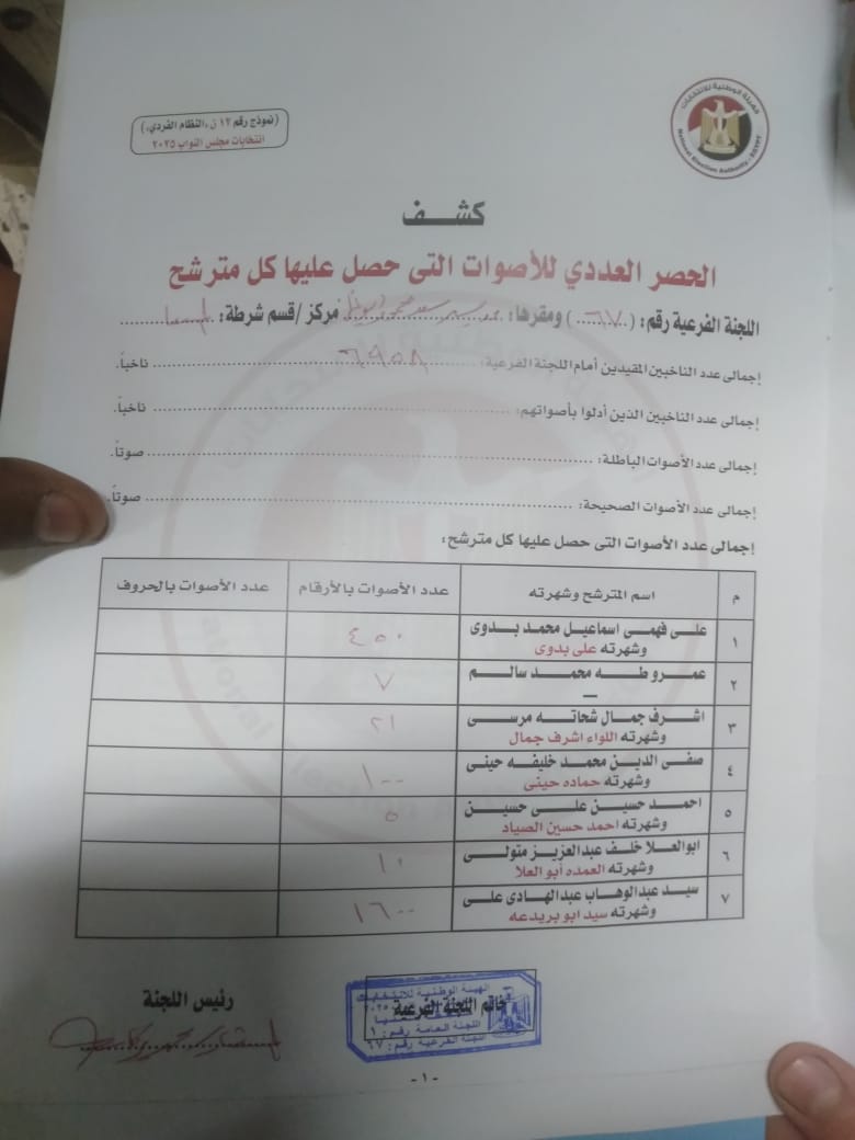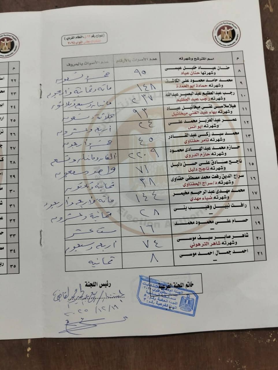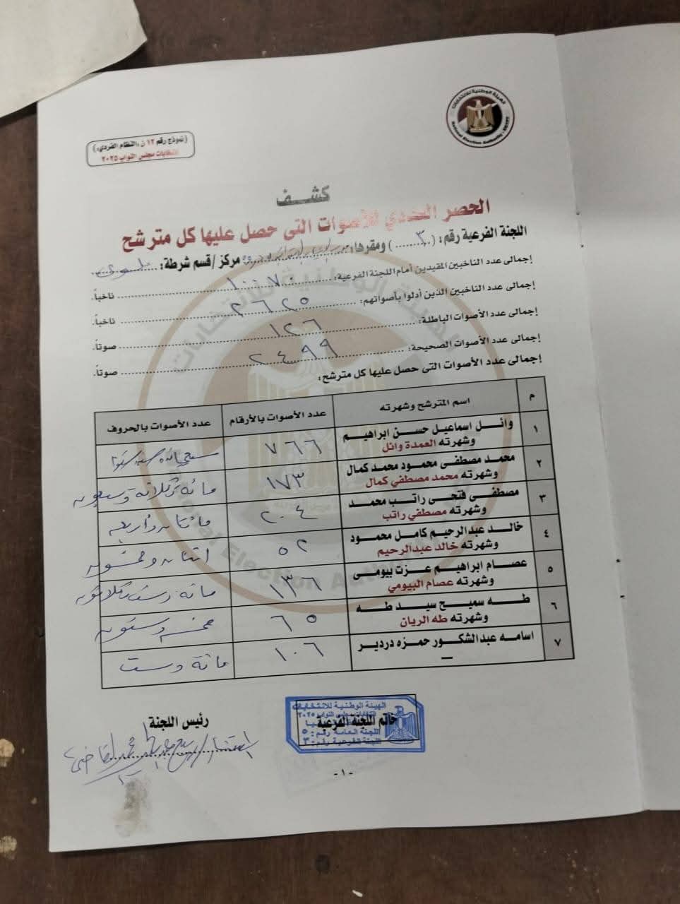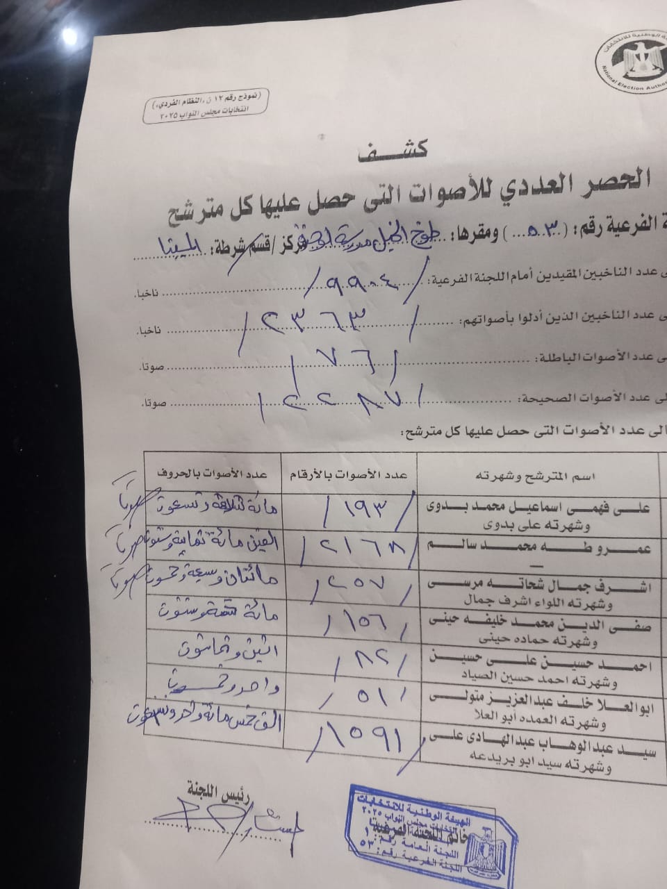 وأظهرت الصور التي حصلت"تليجراف مصر" على نسخة منها بيانات اللجان، ووفقا للمرشحين فإن هناك أخطاء بمحاضر فرز عدد من اللجان في الدائرة الأولى ومقرها مركز وبندر المنيا والمنيا الجديدة، من بينها عدم فرز أصوات لجنة صفط الغربية، وعدم كتابة الأرقام بالحروف، إلى جانب رصد خطأ في الحصر العددي المُثبت بصدر محضر لجنة رقم 53 بقرية طوخ الخيل التابعة لمركز المنيا، فضلًا عن عدم تجميع أصوات لجنة رقم 16 ومقرها بني محمد سلطان.