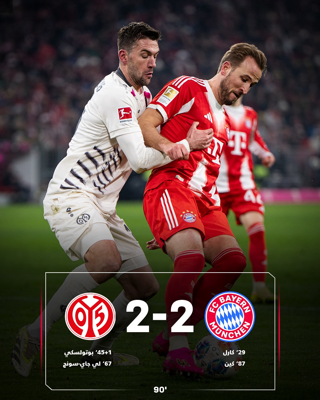 فرض التعادل الإيجابي نفسه على مواجهة بايرن ميونيخ وضيفه ماينز بنتيجة 2-2، في اللقاء الذي جمع الفريقين ضمن منافسات الجولة الرابعة عشرة من بطولة الدوري الألماني "البوندسليجا".