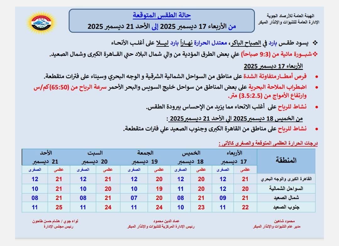 حالة الطقس الأربعاء 17 ديسمبر 2025