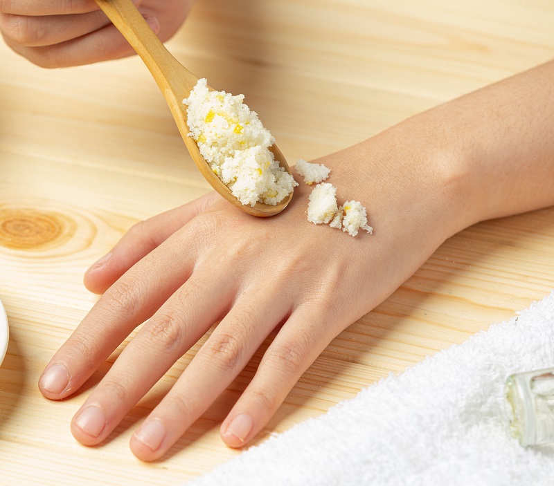 ستحتاجين لملعقة زيت زيتون بالإضافة لملعقة سكر، يتم تطبيقهم على اليدين لمدة دقيقتين، ثم قومي بفركهما بلطف، تعمل تلك الخلطة على زيادة تحفيز الجلد لتقبل الترطيب.