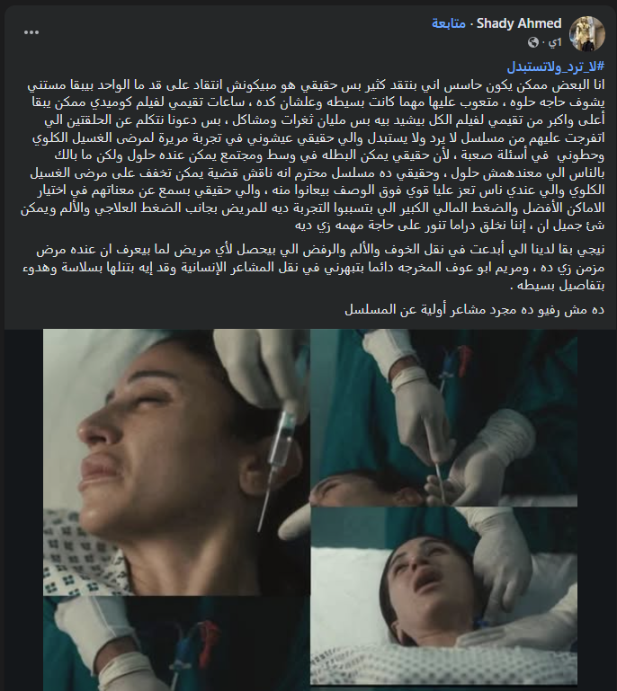 وكتب آخر: “مسلسل لا يرد ولا يستبدل حقيقي عيشوني في تجربة مريرة لمرضى الغسيل الكلوي وحطوني في أسئلة صعبة، يمكن البطلة في وسط ومجتمع عنده حلول، لكن ما بالك بالناس اللي معندهاش حلول، بسمع عن معاناة المرضى في اختيار الأماكن الأفضل والضغط المالي الكبير اللي بتسببوا التجربة دي للمريض بجانب الضغط العلاجي والألم ويمكن شيء جميل، إننا نخلق دراما تنور على حاجة مهمه زي ديه”.