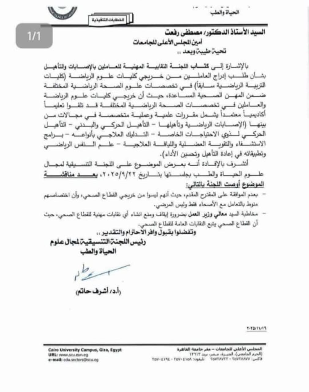 أشار خطاب رسمي صادر عن اللجنة، حصلت "تليجراف مصر"، علي نسخة ضوئية منه، إلى أنه بعرض الموضوع على اللجنة التنسيقية لمجال علوم الحياة والطب في جلستها المنعقدة بتاريخ 22/9/2025، أوصت اللجنة برئاسة الدكتور أشرف حاتم، بعد مناقشة الطلب بعدم الموافقة على المقترح المقدم وهو إدراج العاملين في تخصصات علوم الصحة الرياضية المختلفة ضمن المهن الصحية المساعدة، وذلك في كتابها الموجه إلى أمين المجلس الأعلى للجامعات الدكتور مصطفى رفعت.