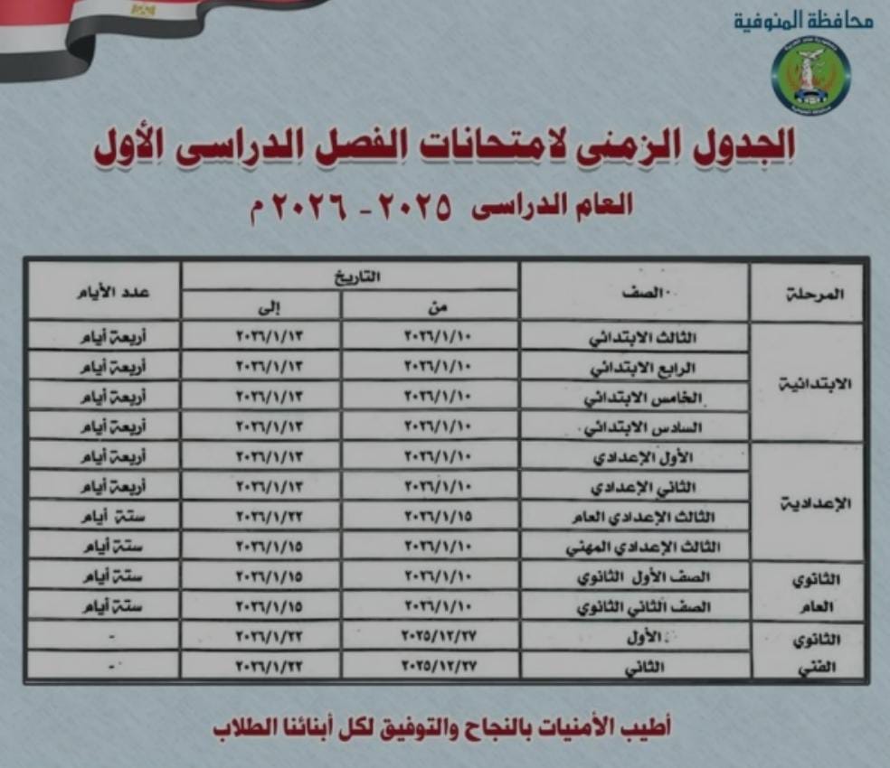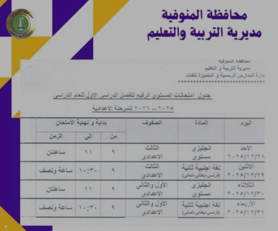 جدول امتحانات نصف العام 2026 الصف الثالث الإعدادي محافظة المنوفية