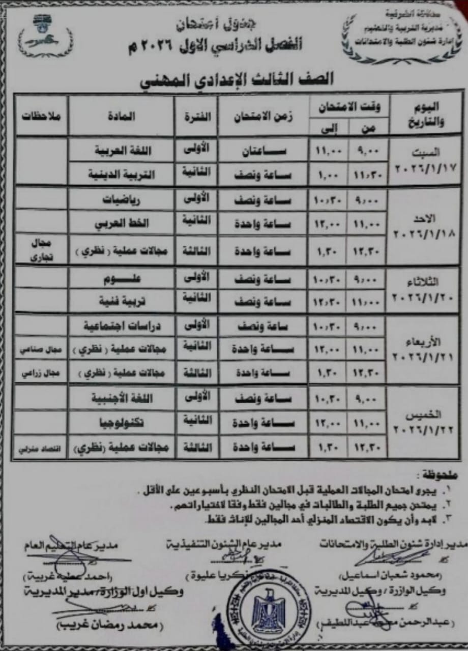 جدول امتحانات نصف العام 2026 الصف الثالث الإعدادي المهني محافظة الشرقية