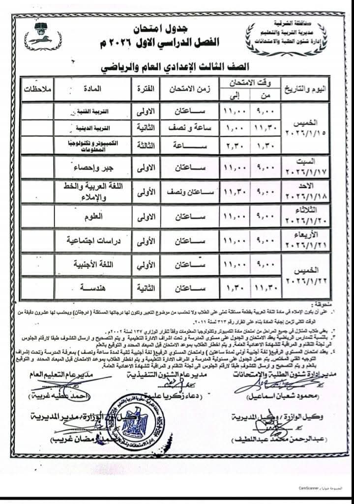 جدول امتحانات نصف العام 2026 الصف الثالث الإعدادي محافظة الشرقية