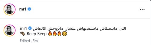 ونشر محمد رمضان عبر حسابه الرسمي بموقع “إنستجرام”، البوستر الدعائي لأغنيته الجديدة “ بيب بيب”، وعلق قائلا: “اللي مابيحبناش مايسمعهاش علشان مايروحش الانعاش Beep Beep”.